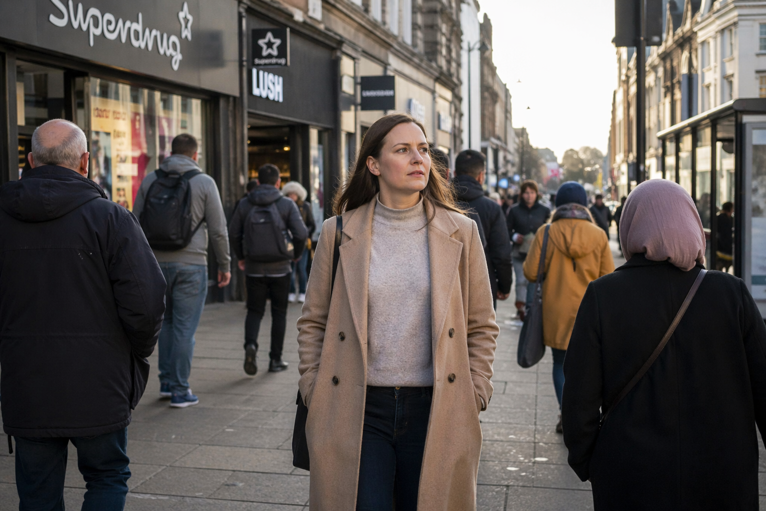 A person walking through a busy town centre, looking alert and relaxed rather than distracted by their phone